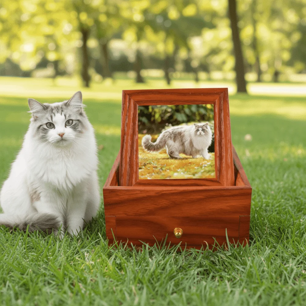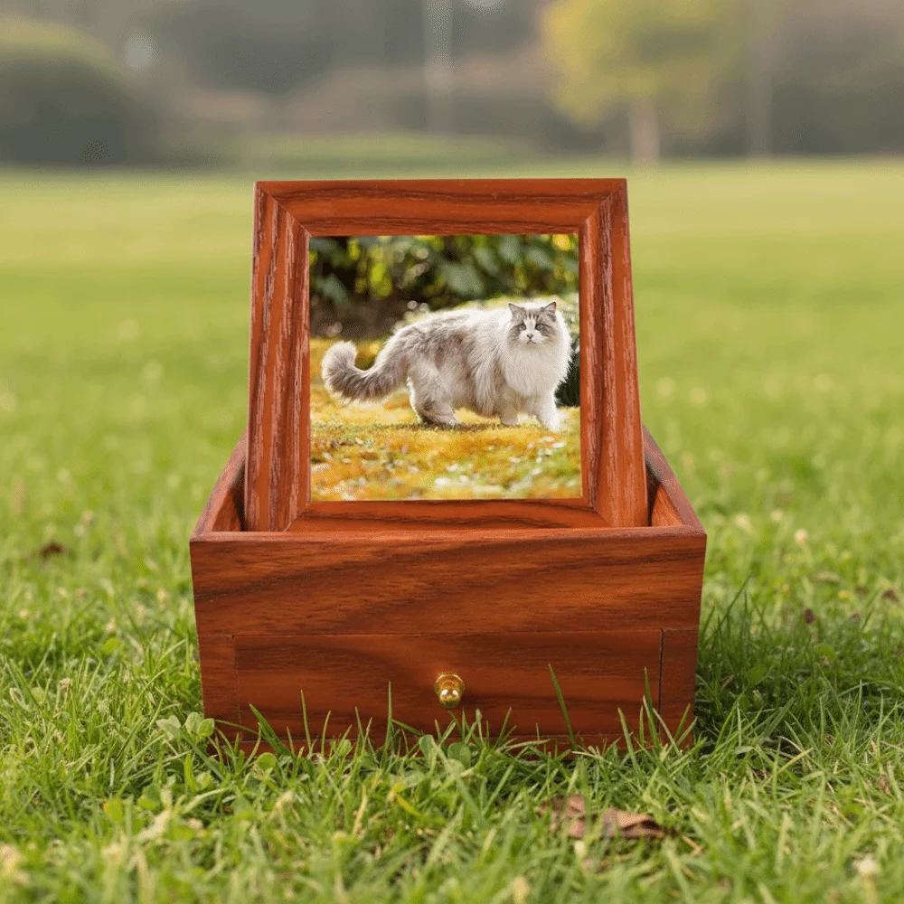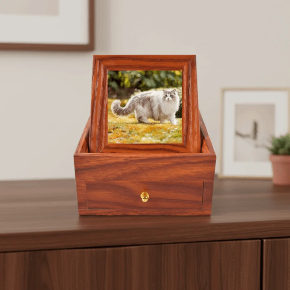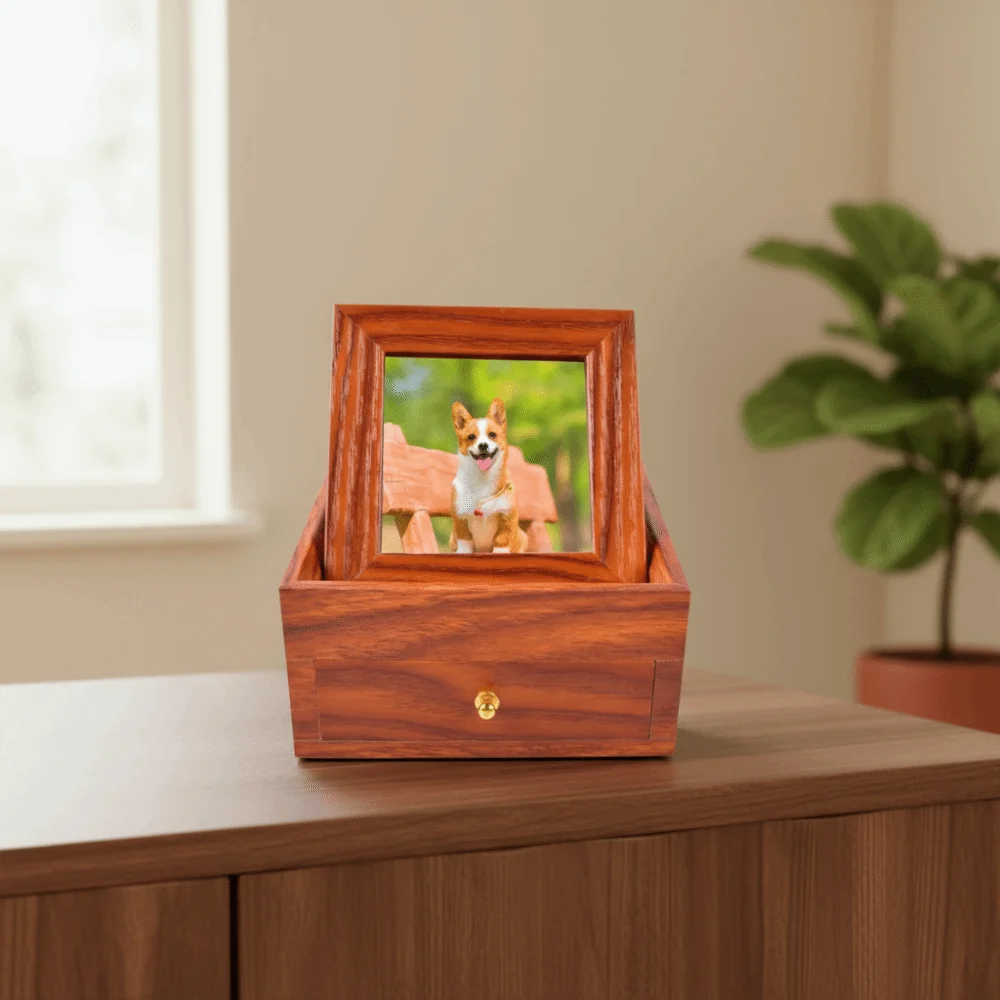 This wooden pet ashes box provides a respectful and elegant resting place for your beloved pet.
